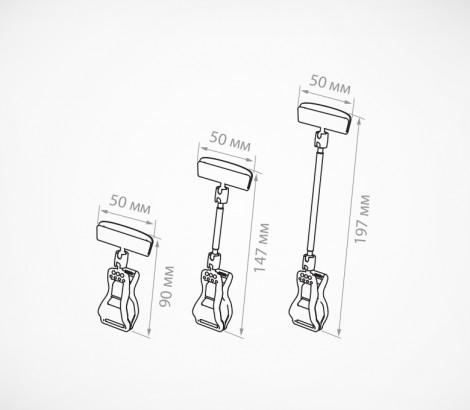 Крепится на торец полки, корзину толщиной до 25 мм. При креплении на трубу - максимальный Ø трубы - 32 мм. Ширина держателя ценника - 50 мм. Три варианта высоты ножки - 0, 50, 100 мм.