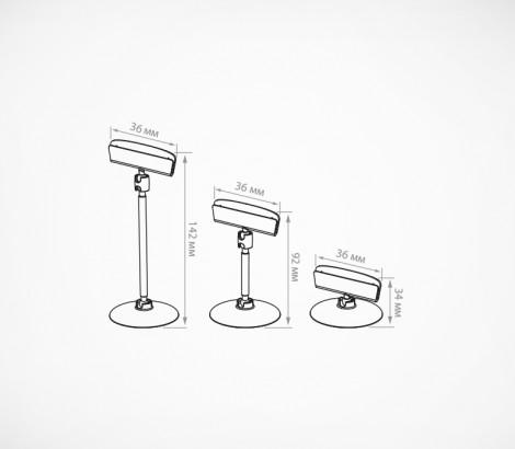 Ценникодержатель на прозрачной пластиковой подставке. Шарнирное соединение позволяет регулировать угол наклона. Три  варианта  длины ножки  -  0,  50,  100  мм.