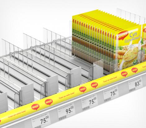 Используется передний профиль с ценникодержателем. Высота рекламной вставки - 30 мм. Имеет Т-профиль для крепления разделителей и толкателей. Крепится на полку на двухсторонний скотч.