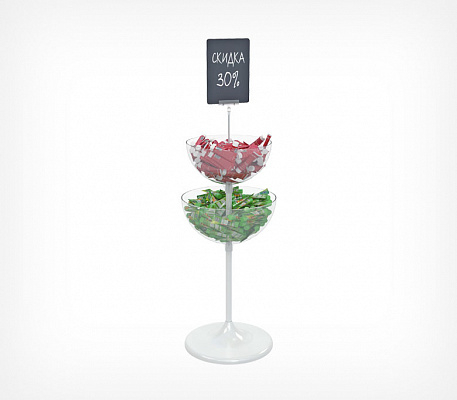 UNIBOWL-TOWER — двухуровневый дисплей, состоящий из двух чаш разных объёмов. Позволяет делать выкладку сразу двух товаров и ещё более эффективно использовать торговую площадь, увеличивая продажи.