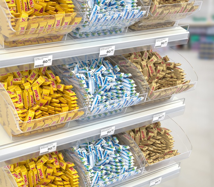 Контейнер SPACEBOX применяется для размещения и удобной выкладки развесных и мелких продуктов на прямых и наклонных полках торгового оборудования